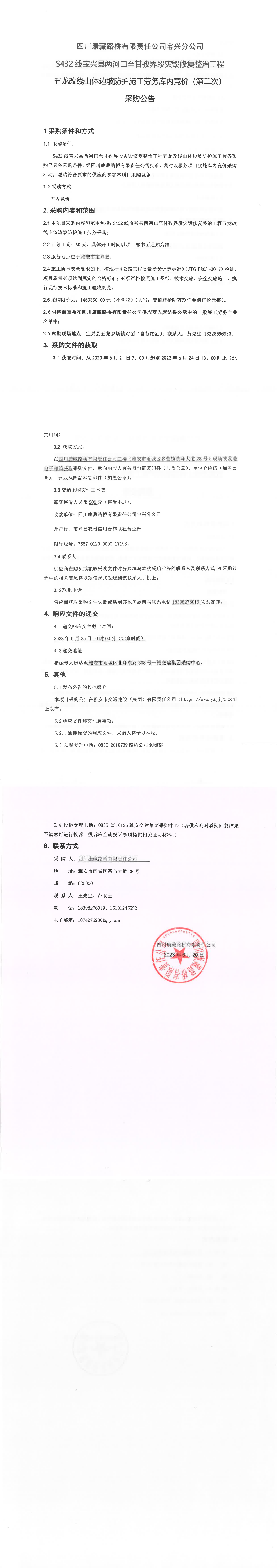 四川康藏路橋有限責任公司寶興分公司S432線寶興縣兩河口至甘孜界段災毀修復整治工程五龍改線山體邊坡防護施工勞務庫內(nèi)競價(第二次)采購公告