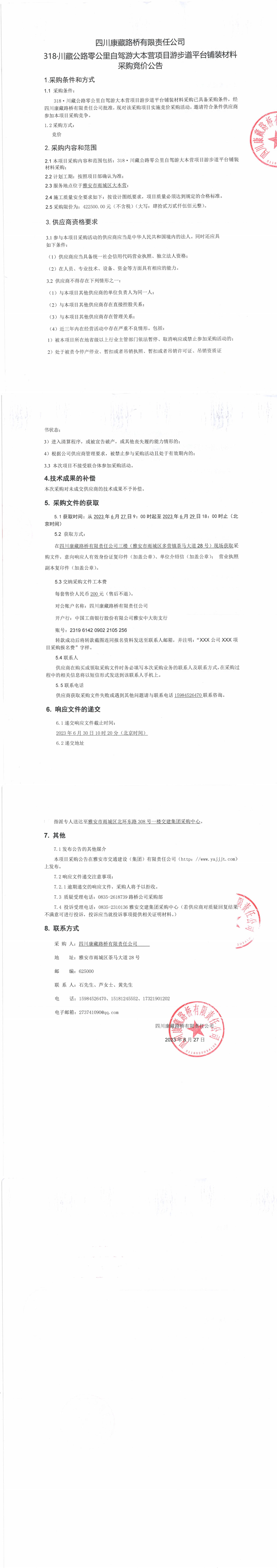 四川康藏路橋有限責(zé)任公司318·川藏公路零公里自駕游大本營項(xiàng)目步游道平臺鋪裝材料采購競價(jià)公告