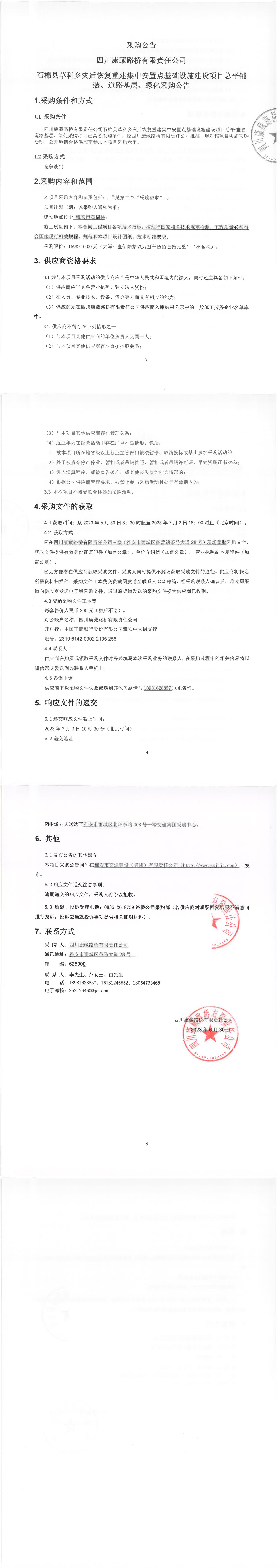 四川康藏路橋有限責任公司石棉縣草科鄉(xiāng)災后恢復重建集中安置點基礎(chǔ)設(shè)施建設(shè)項目總平鋪裝、道路基層、綠化采購公告