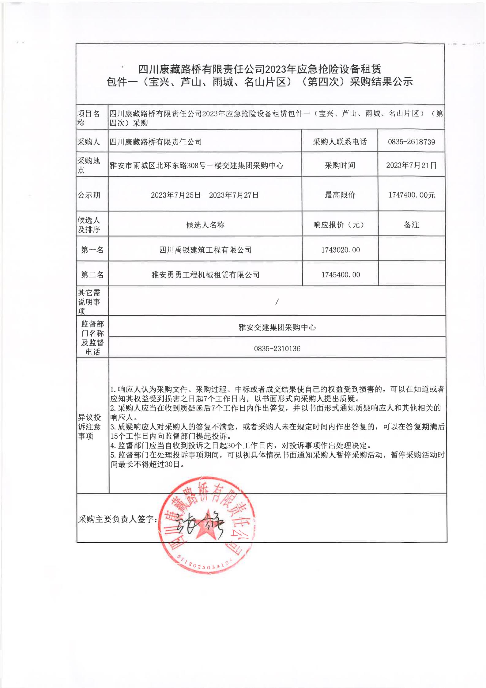 四川康藏路橋有限責任公司2023年應急搶險設備租賃包件一(寶興、蘆山、雨城、名山片區(qū))(第四次)采購結果公示