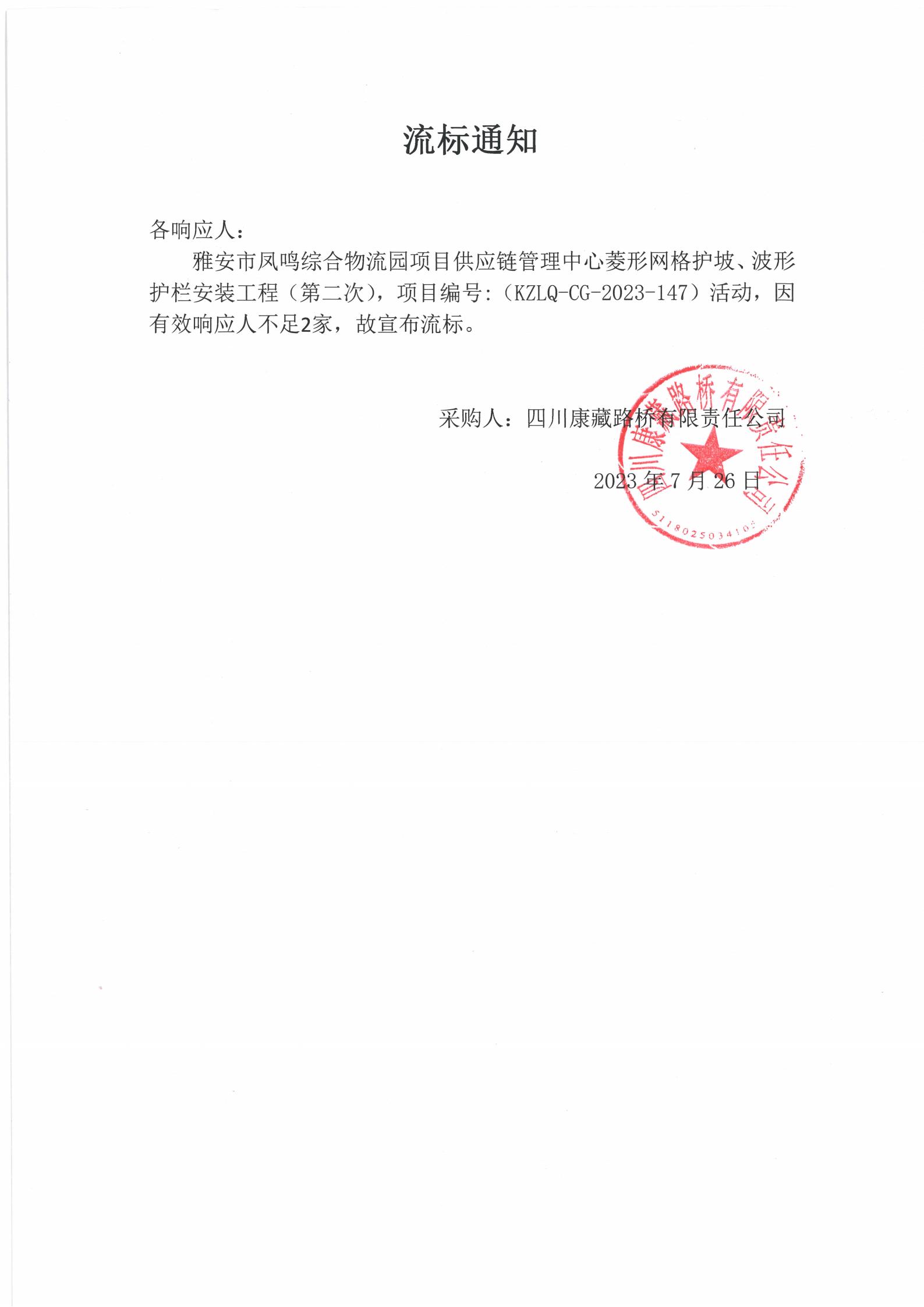 四川康藏路橋有限責(zé)任公司雅安市鳳鳴綜合物流園項目供應(yīng)鏈管理中心菱形網(wǎng)格護坡、波形護欄安裝工程(第二次)流標(biāo)通知