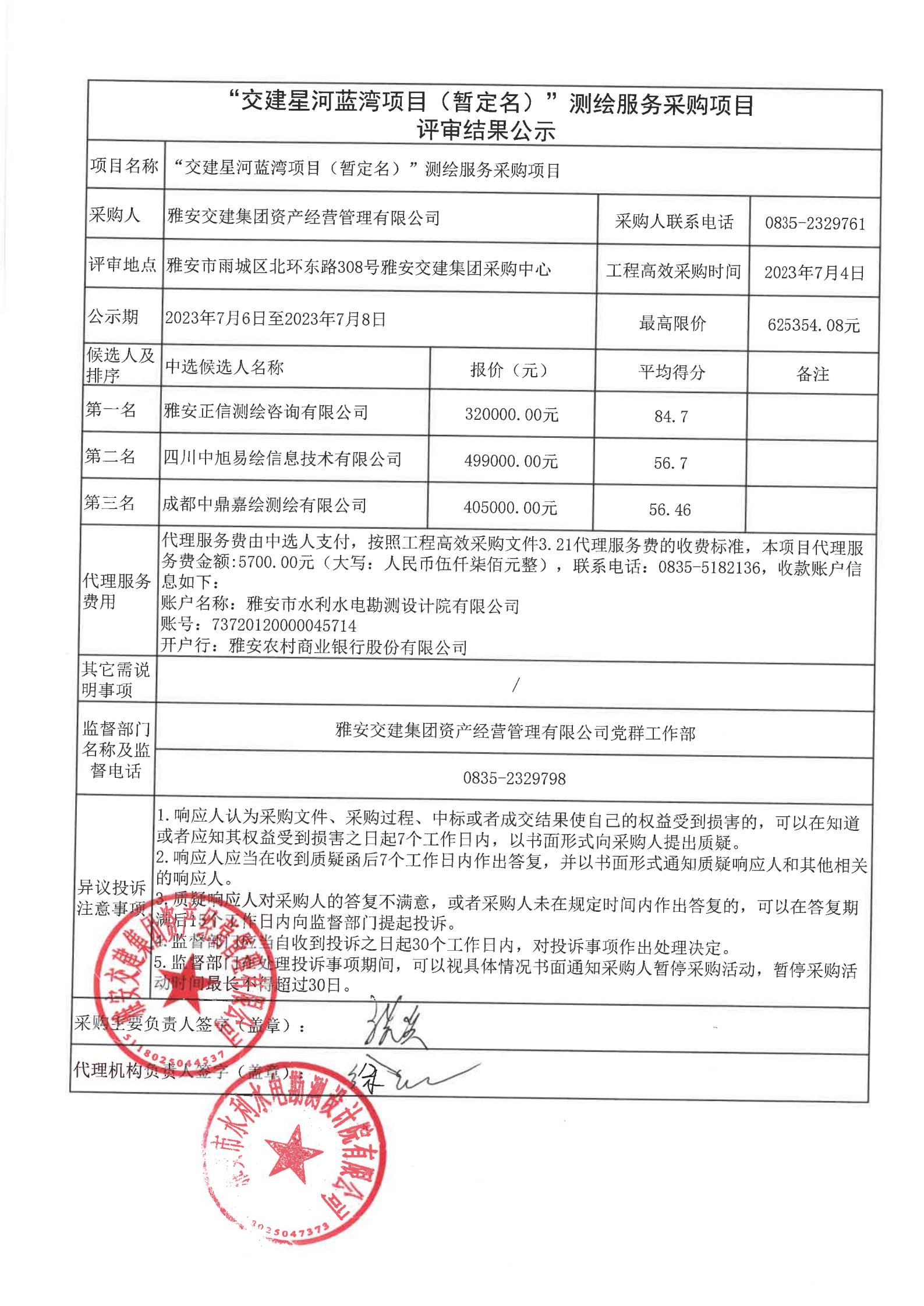 雅安交建集團(tuán)資產(chǎn)經(jīng)營(yíng)管理有限公司“交建星河藍(lán)灣項(xiàng)目(暫定名)”測(cè)繪服務(wù)采購(gòu)項(xiàng)目評(píng)審結(jié)果公示