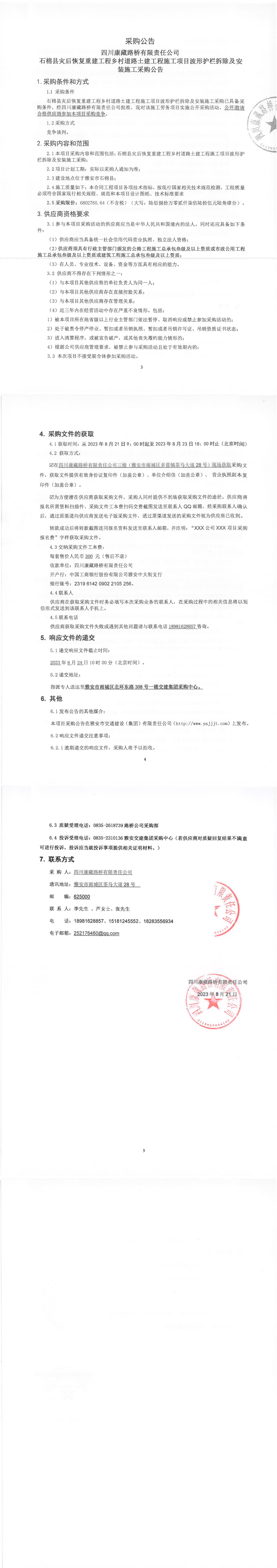四川康藏路橋有限責(zé)任公司石棉縣災(zāi)后恢復(fù)重建工程鄉(xiāng)村道路土建工程施工項(xiàng)目波形護(hù)欄拆除及安裝施工采購(gòu)公告