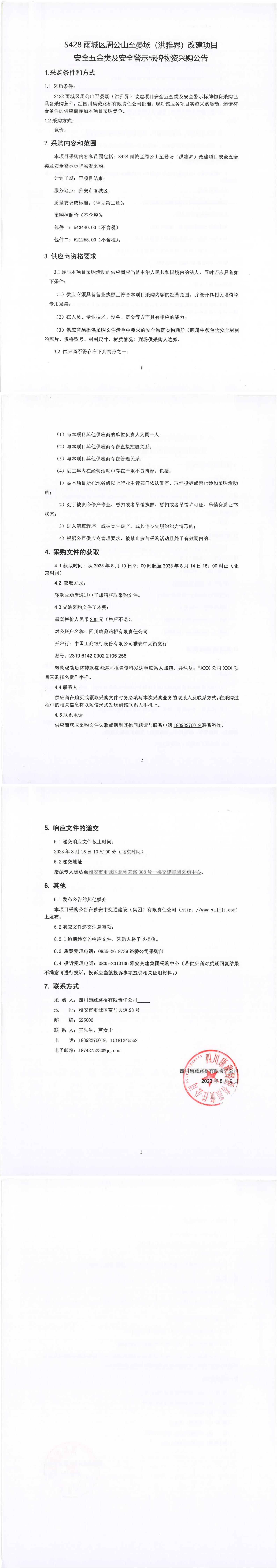 四川康藏路橋有限責(zé)任公司S428雨城區(qū)周公山至宴場(洪雅界)改建項目安全五金類及安全警示標(biāo)牌物資采購公告
