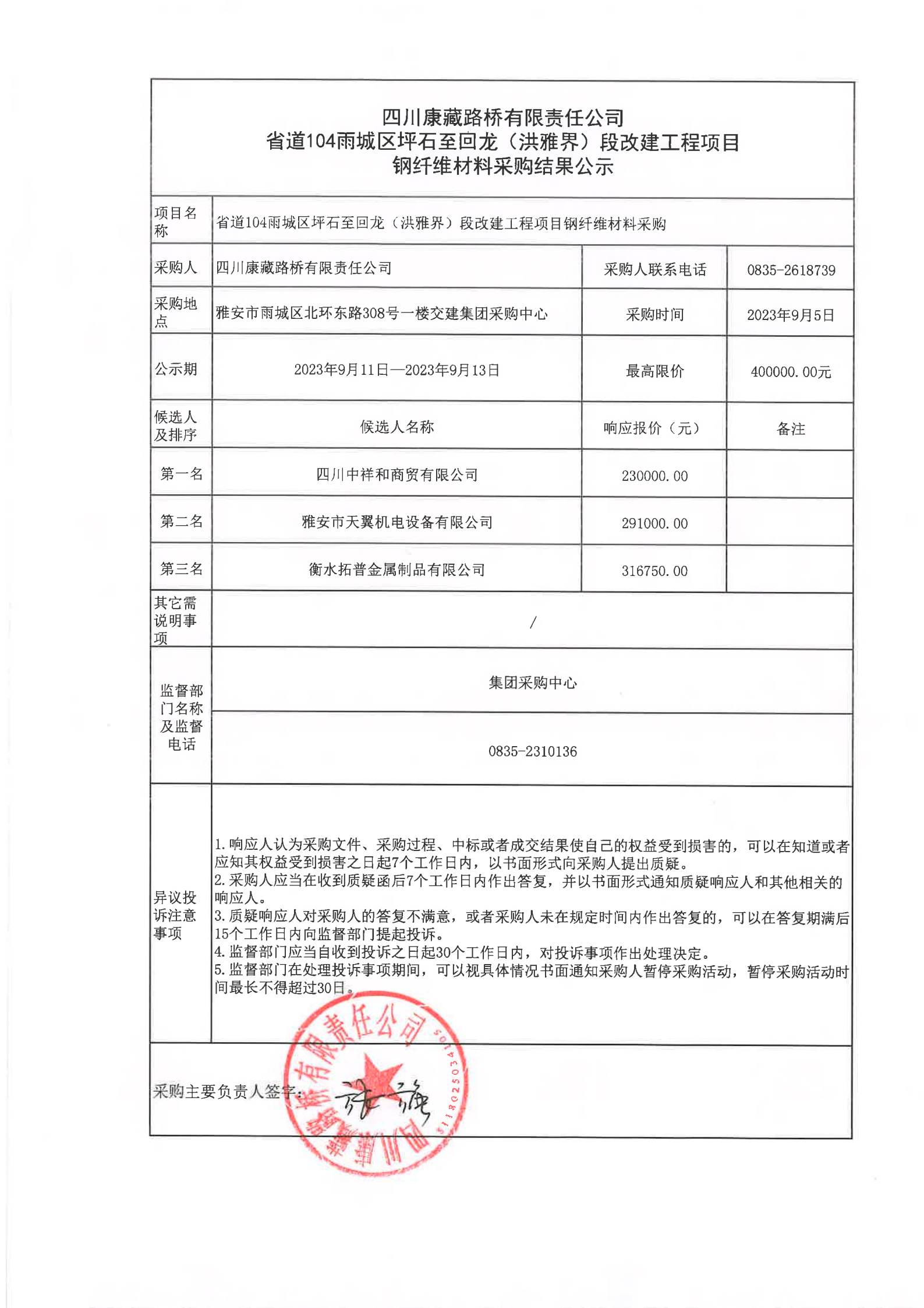 四川康藏路橋有限責(zé)任公司省道104雨城區(qū)坪石至回龍(洪雅界)段改建工程項(xiàng)目鋼纖維材料采購結(jié)果公示