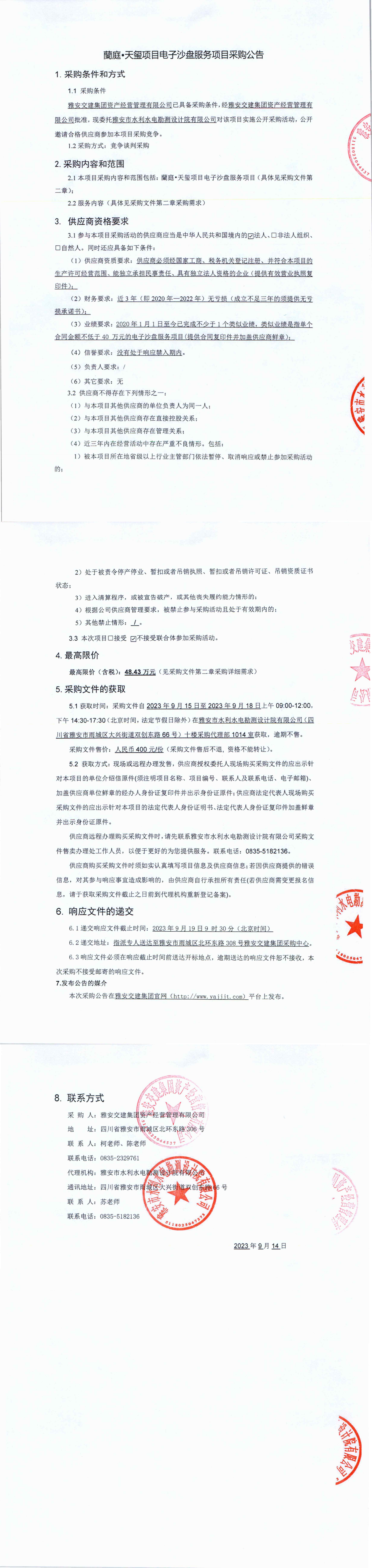 雅安交建集團資產(chǎn)經(jīng)營管理有限公司交建蘭庭·天璽項目電子沙盤服務(wù)項目競爭談判公告