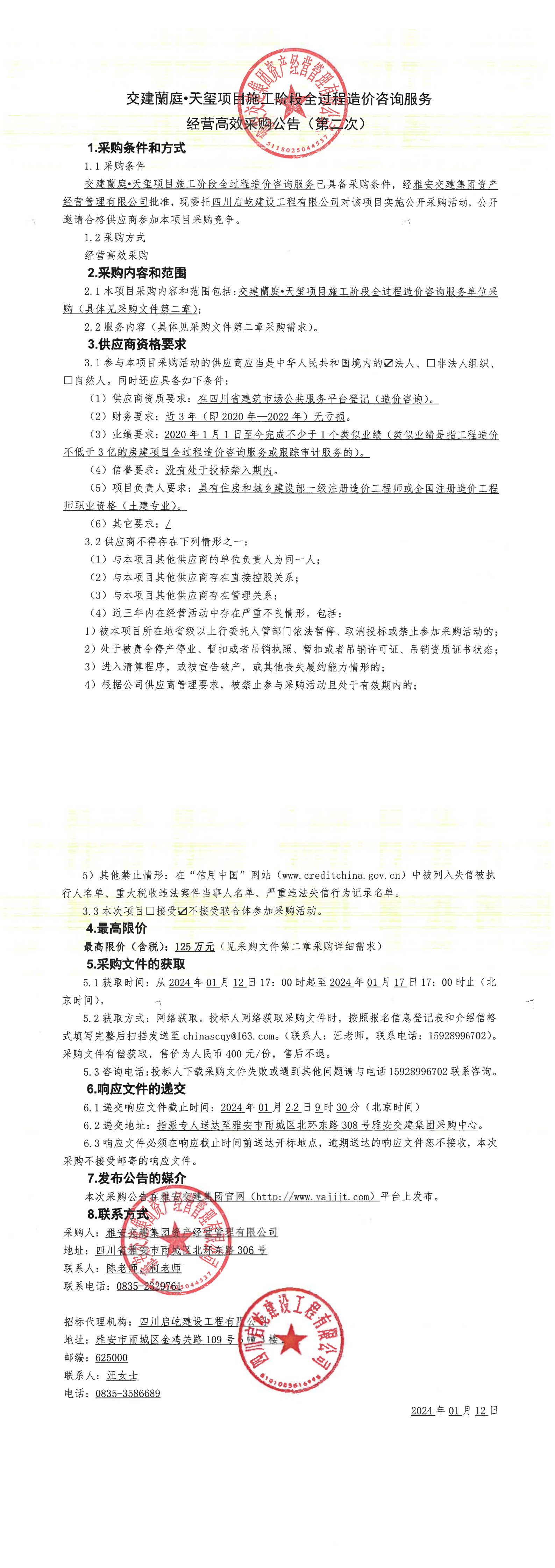 雅安交建集團(tuán)資產(chǎn)經(jīng)營管理有限公司交建蘭庭·天璽項目施工階段全過程造價咨詢服務(wù)經(jīng)營高效采購公告(第二次)