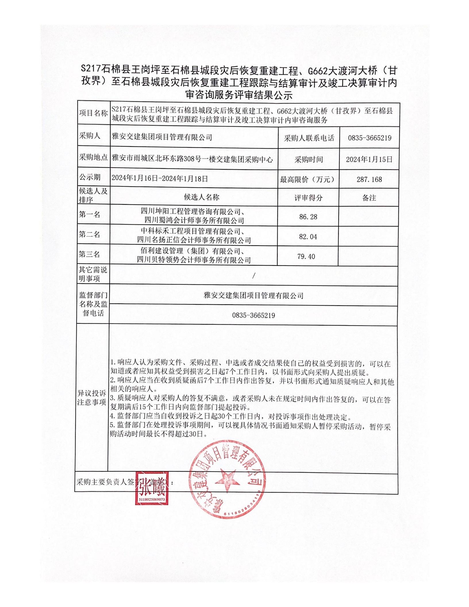 雅安交建集團項目管理有限公司S217石棉縣王崗坪至石棉縣城段災后恢復重建工程、G662大渡河大橋(甘孜界)至石棉縣城段災后恢復重建工程跟蹤與結(jié)算審計及竣工決算審計內(nèi)審咨詢服務評審結(jié)果公示
