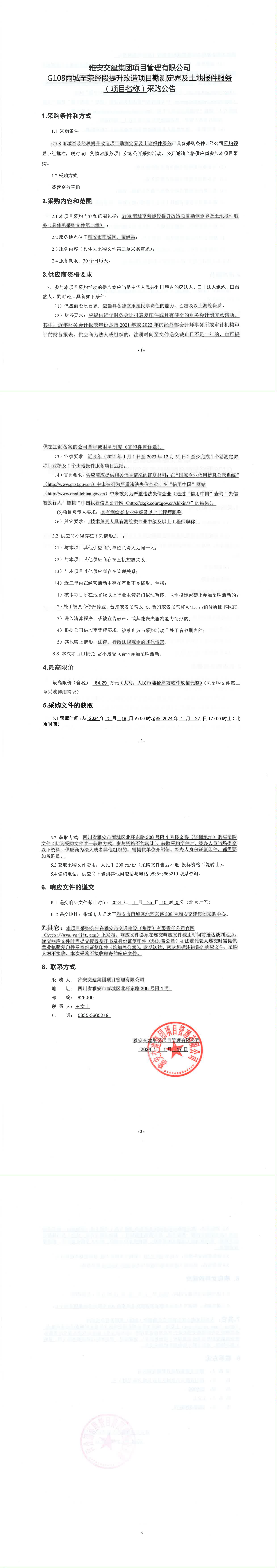 雅安交建集團項目管理有限公司G108雨城至滎經段提升改造項目勘測定界及土地報件服務(項目名稱)采購公告