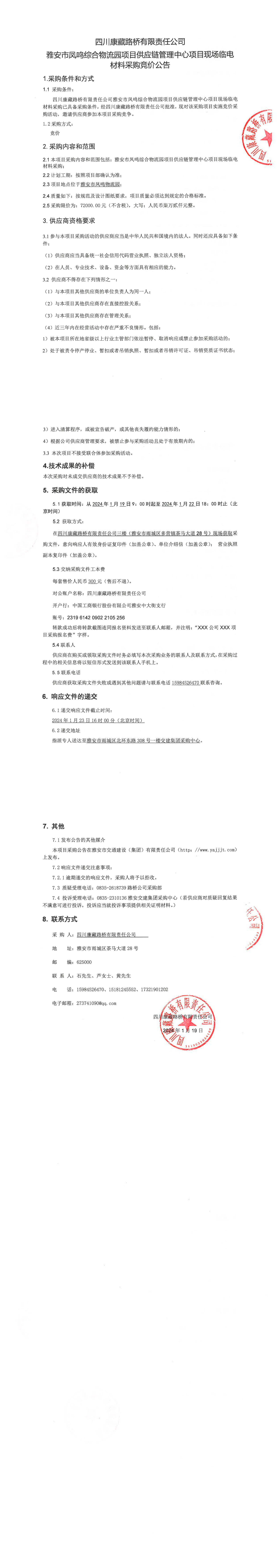 四川康藏路橋有限責(zé)任公司雅安市鳳鳴綜合物流園項目供應(yīng)鏈管理中心項目現(xiàn)場臨電材料采購競價公告