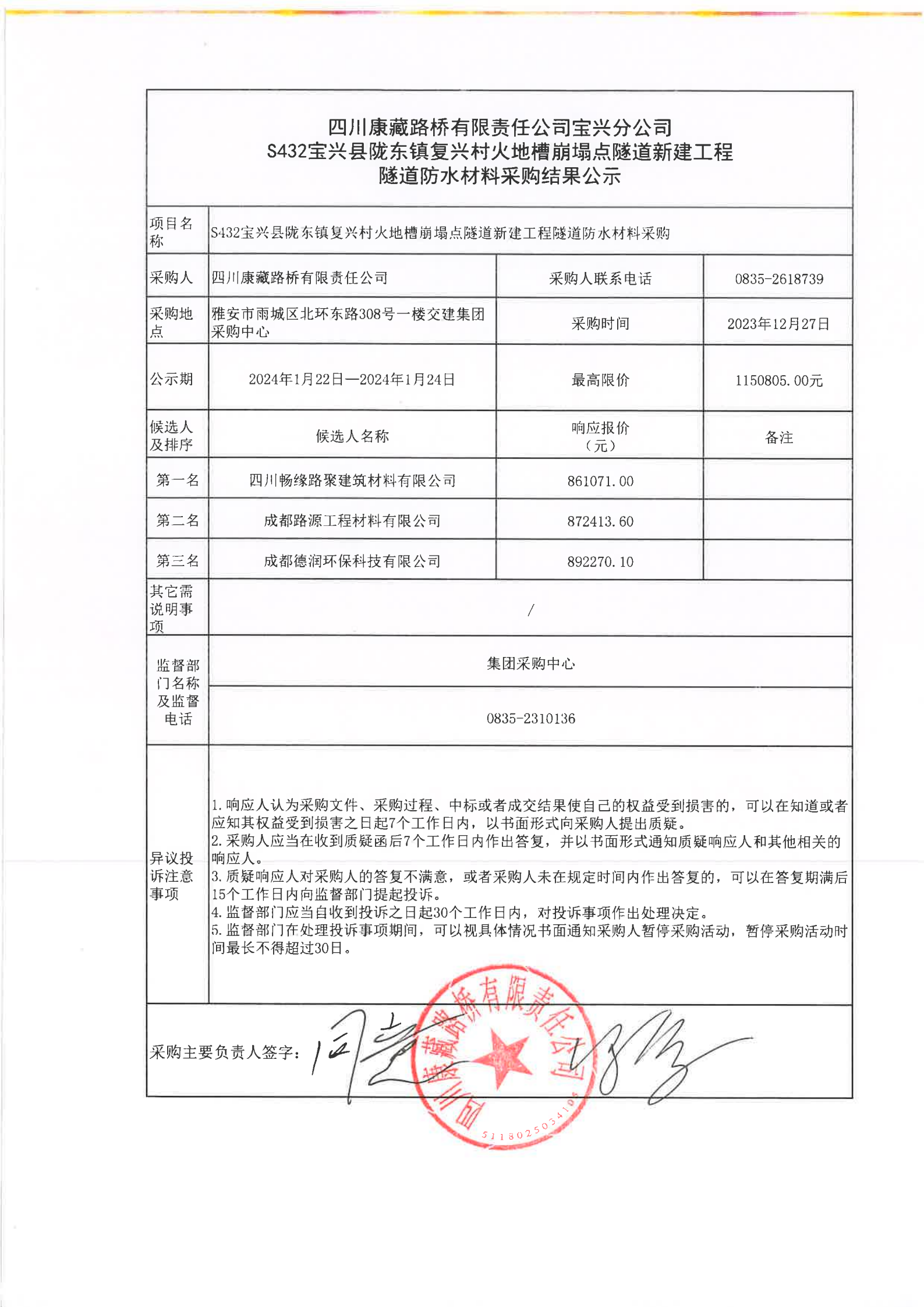 四川康藏路橋有限責(zé)任公司寶興分公司S432寶興縣隴東鎮(zhèn)復(fù)興村火地槽崩塌點隧道新建工程隧道防水材料采購結(jié)果公示