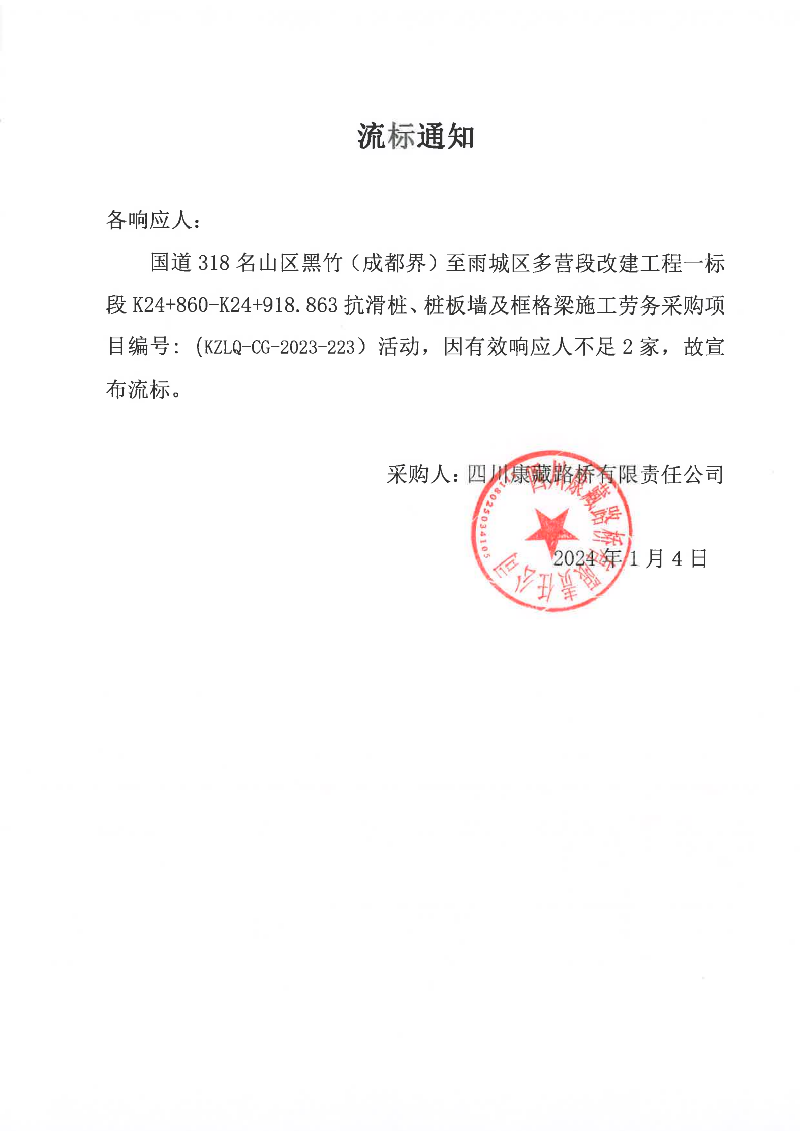 四川康藏路橋有限責任公司國道318名山區(qū)黑竹(成都界)至雨城區(qū)多營段改建工程一標段K24+860-K24+918.863抗滑樁、樁板墻及框格梁施工勞務采購項目流標通知