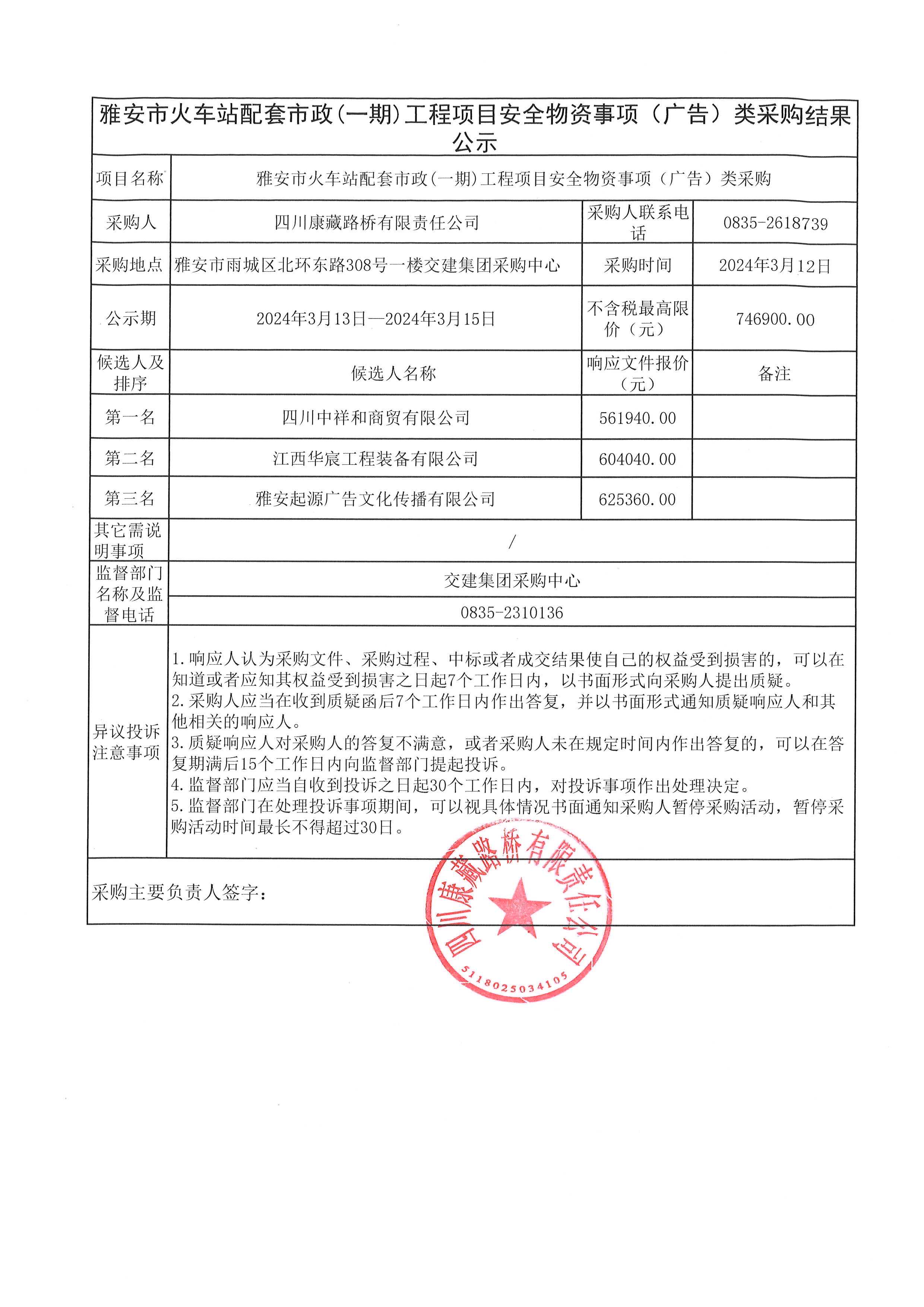 四川康藏路橋有限責任公司雅安市火車站配套市政(一期)工程項目安全物資(廣告)采購結(jié)果公示