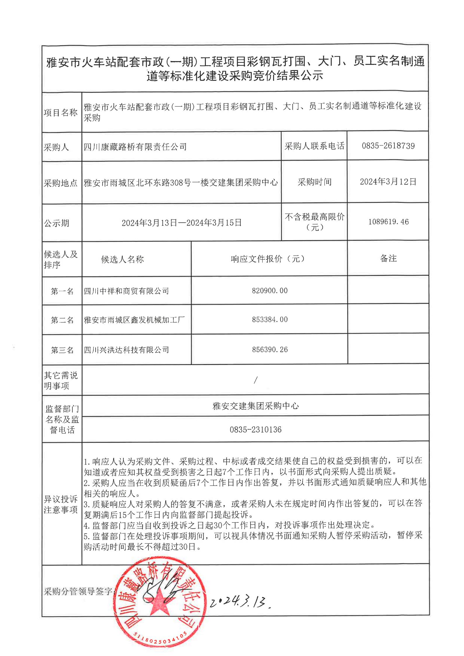 四川康藏路橋有限責任公司雅安市火車站配套市政(一期)工程項目彩鋼瓦打圍、大門、員工實名制通道等標準化建設(shè)采購結(jié)果公示