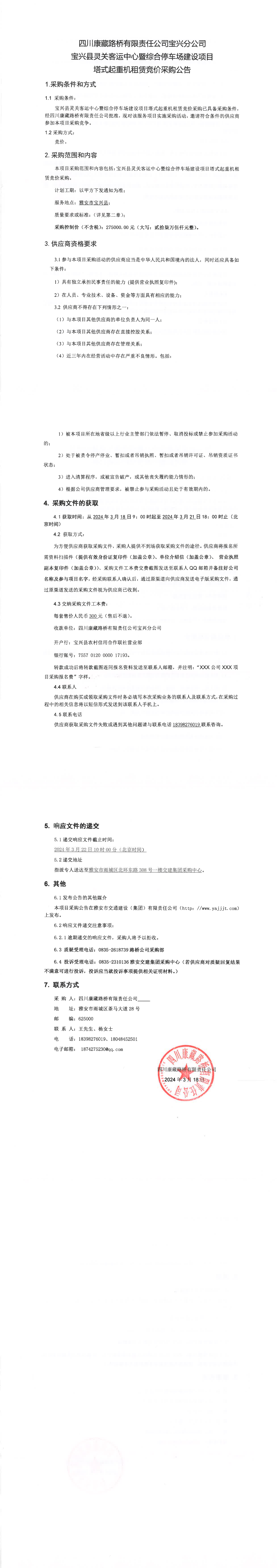 四川康藏路橋有限責(zé)任公司寶興縣靈關(guān)客運(yùn)中心暨綜合停車場(chǎng)建設(shè)項(xiàng)目塔式起重機(jī)租賃競(jìng)價(jià)采購(gòu)公告