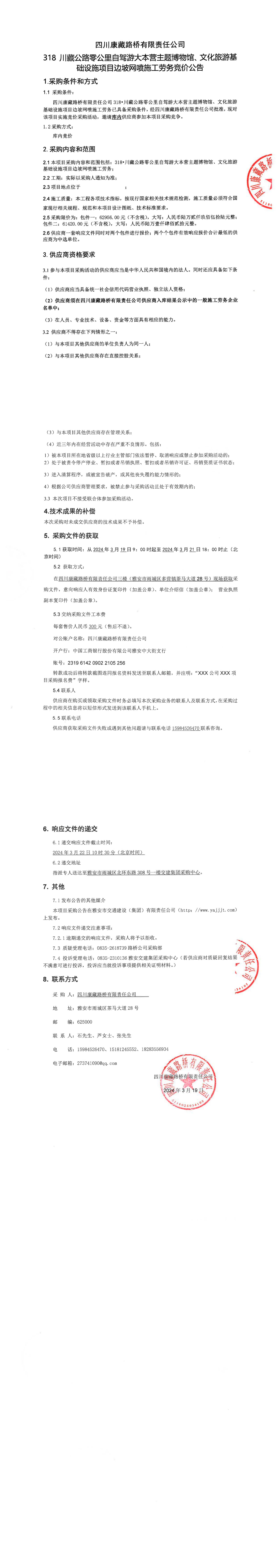 四川康藏路橋有限責任公司318•川藏公路零公里自駕游大本營主題博物館、文化旅游基礎設施項目邊坡網(wǎng)噴施工勞務采購公告