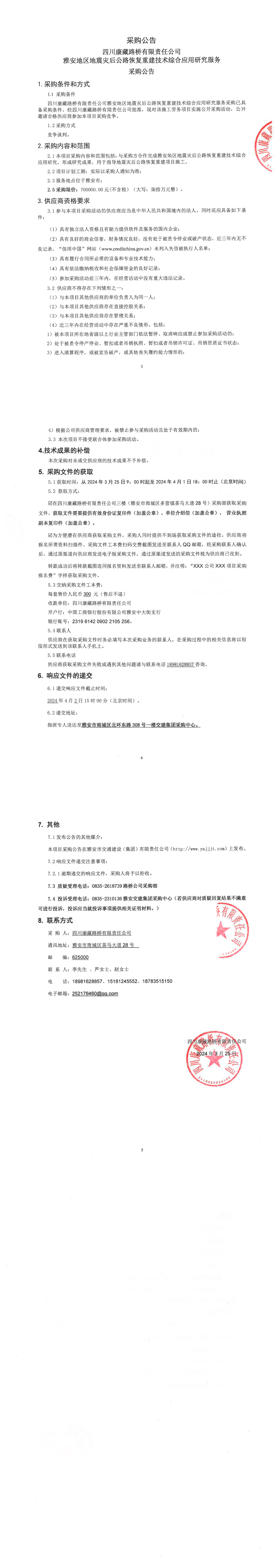 四川康藏路橋有限責(zé)任公司雅安地區(qū)地震災(zāi)后公路恢復(fù)重建技術(shù)綜合應(yīng)用研究服務(wù)采購公告