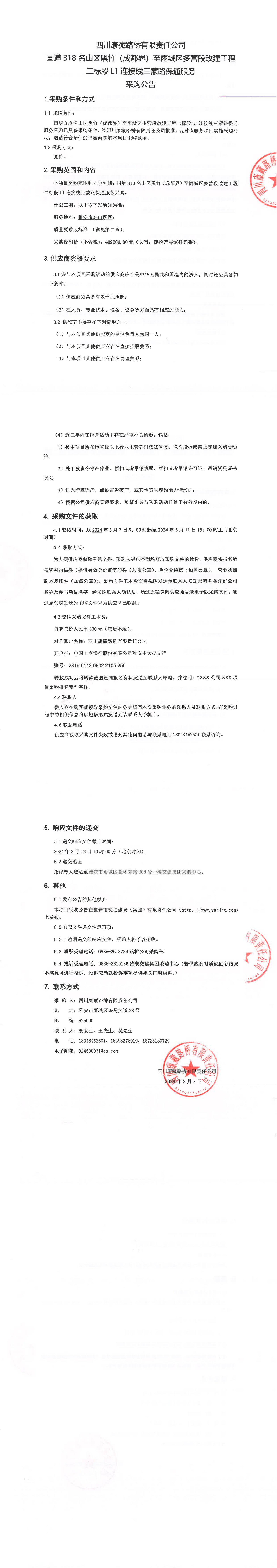 四川康藏路橋有限責任公司國道318名山區(qū)黑竹(成都界)至雨城區(qū)多營段改建工程二標段L1連接線三蒙路保通服務(wù)采購公告