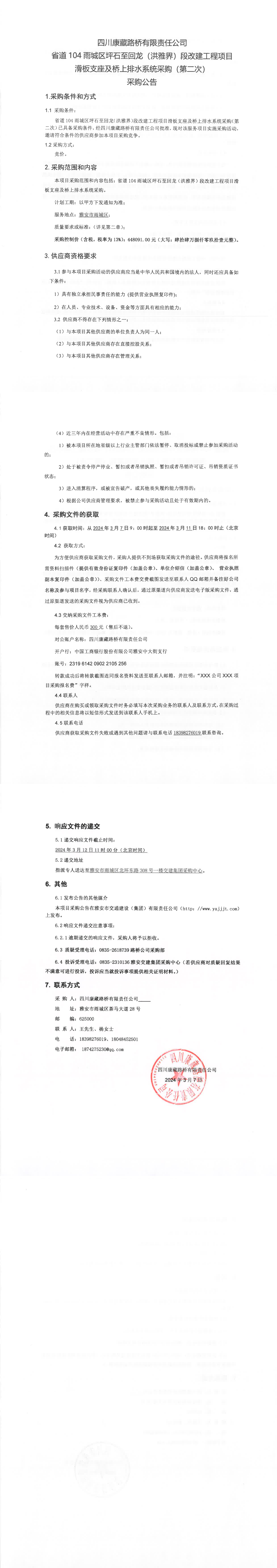 四川康藏路橋有限責(zé)任公司省道104雨城區(qū)坪石至回龍(洪雅界)段改建工程項(xiàng)目滑板支座及橋上排水系統(tǒng)采購(第二次)采購公告