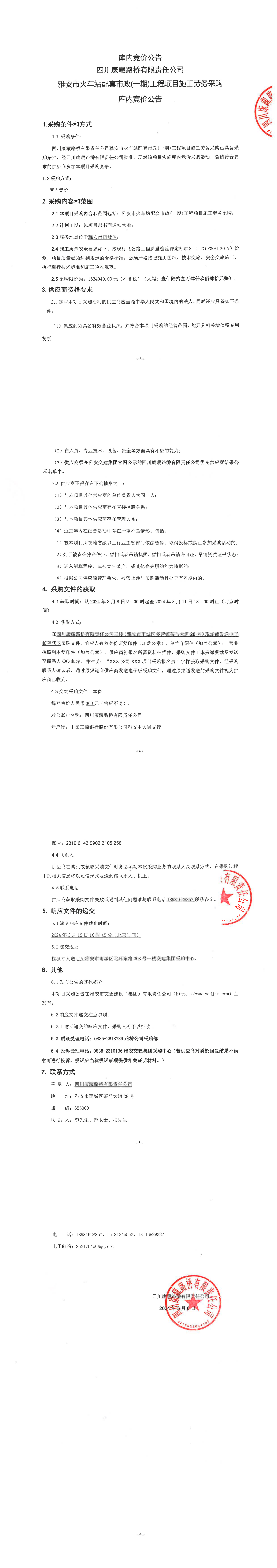 四川康藏路橋有限責(zé)任公司雅安市火車站配套市政(一期)工程項(xiàng)目施工勞務(wù)采購(gòu)庫(kù)內(nèi)競(jìng)價(jià)公告