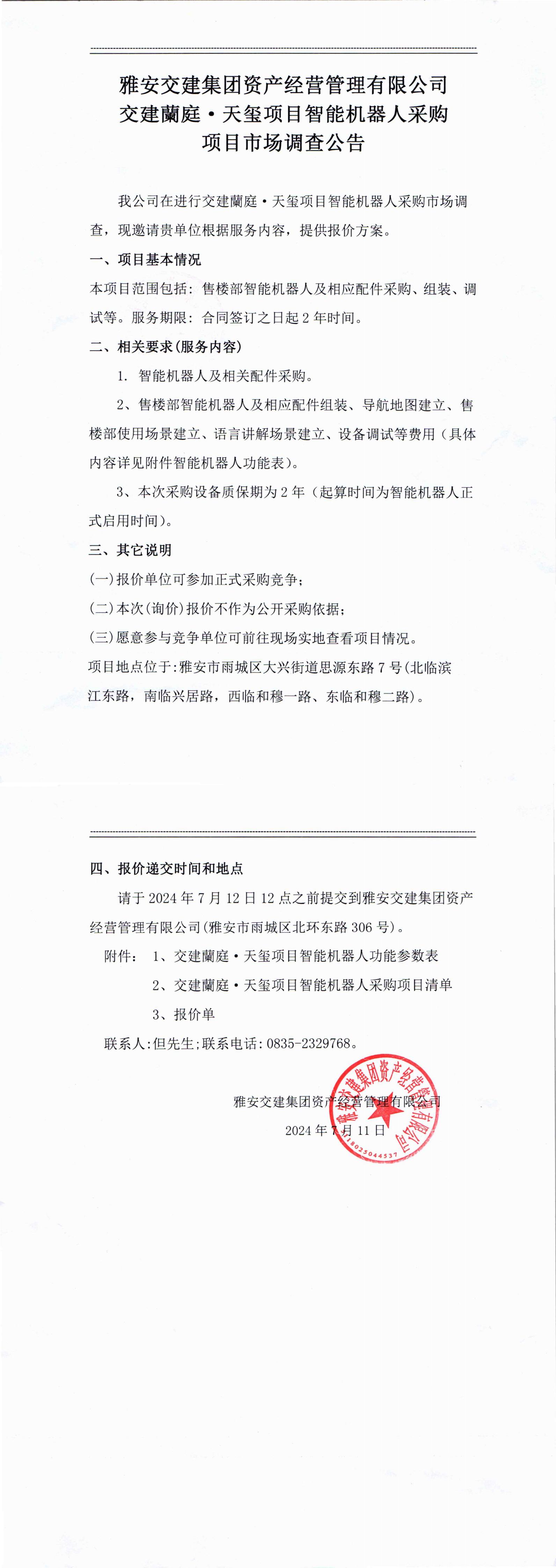 雅安交集團(tuán)資產(chǎn)經(jīng)營管理有限公司交建蘭庭·天璽項目智能機(jī)器人采購項目市場調(diào)查公告