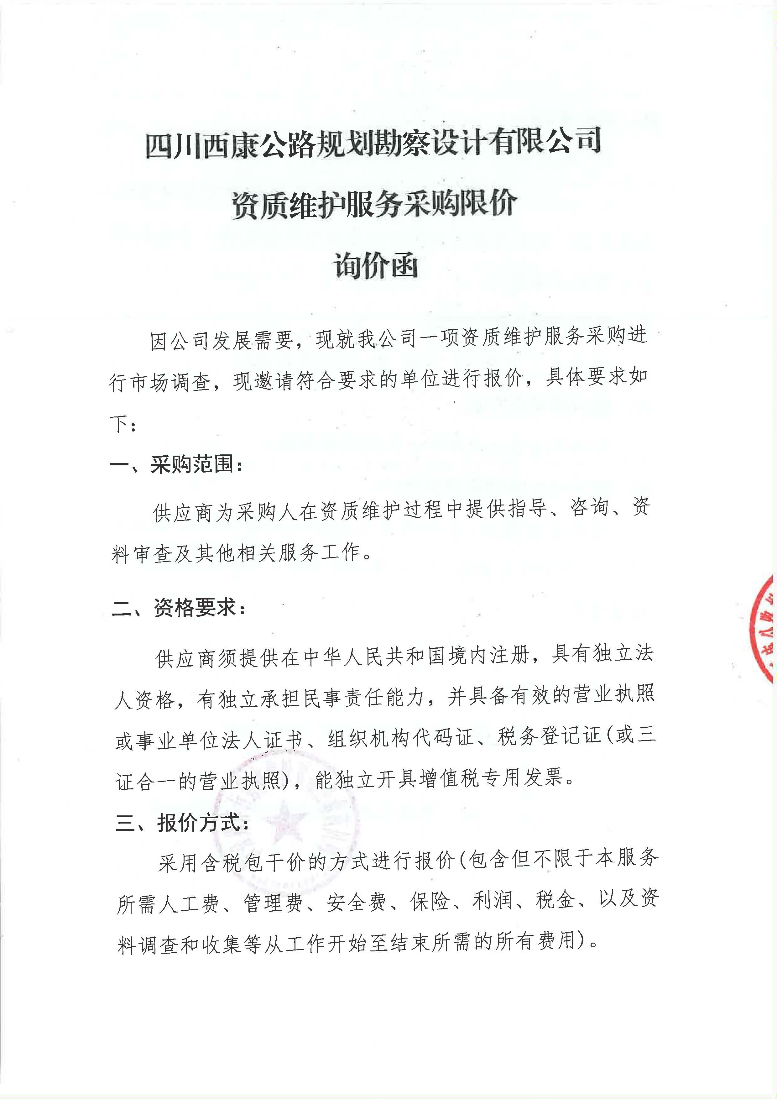 四川西康公路規(guī)劃勘察設(shè)計有限公司資質(zhì)維護服務(wù)采購限價詢價函