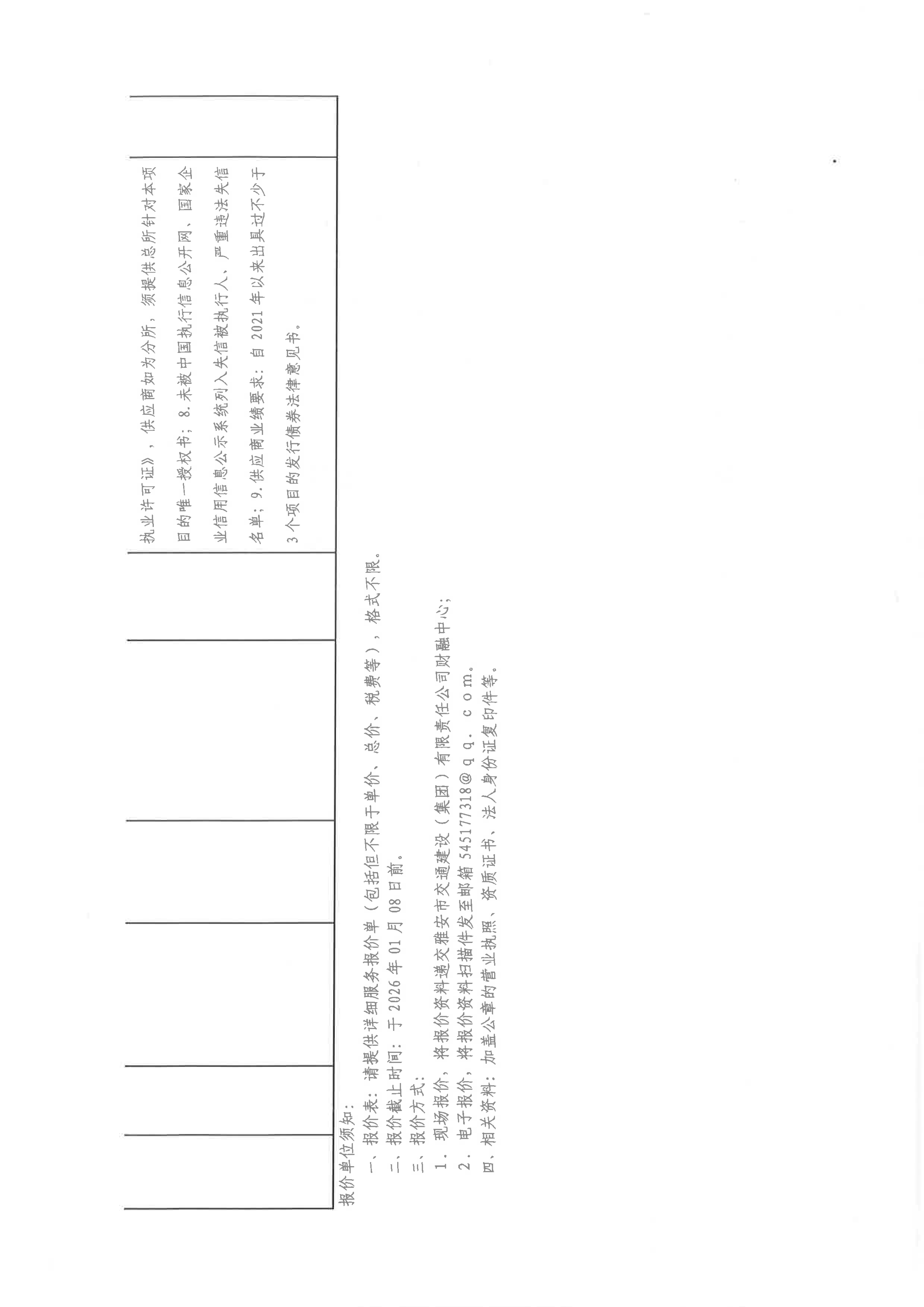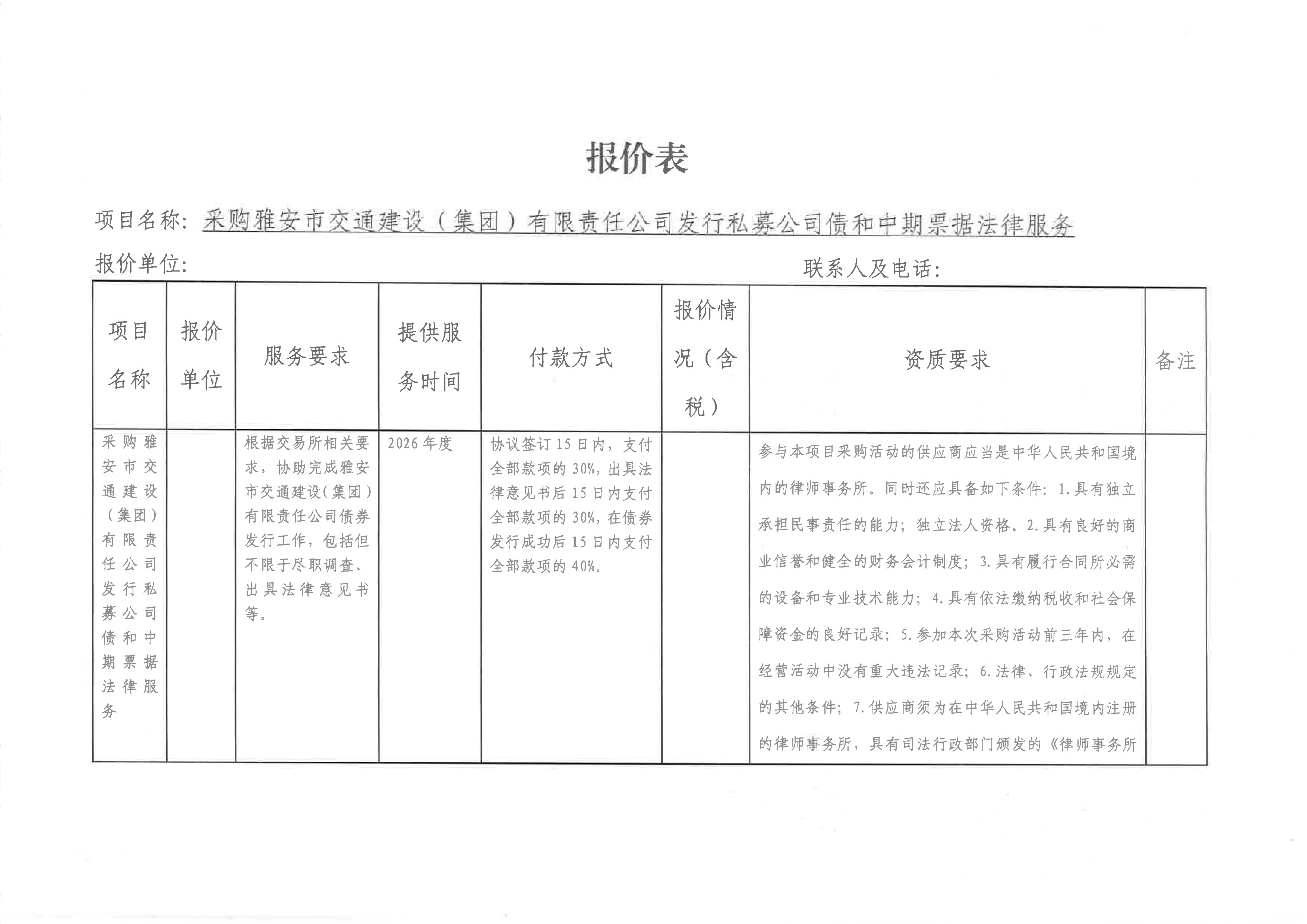 關(guān)于雅安市交通建設(shè)(集團(tuán))有限責(zé)任公司發(fā)行私募公司債和中期票據(jù)所需法律服務(wù)采購限價(jià)的詢價(jià)函