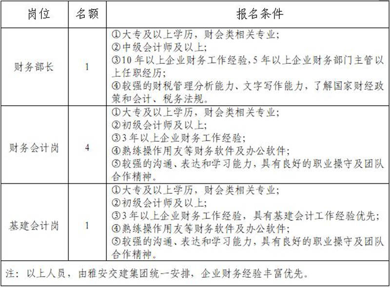 根據(jù)發(fā)展需要,決定面向社會(huì)公開(kāi)招聘雅安市交通建設(shè)(集團(tuán))有限責(zé)任公司(以下簡(jiǎn)稱(chēng)“雅安交建集團(tuán)”)所屬子公司財(cái)務(wù)部門(mén)負(fù)責(zé)人1名,工作人員5名,現(xiàn)將有關(guān)事項(xiàng)公告如下: