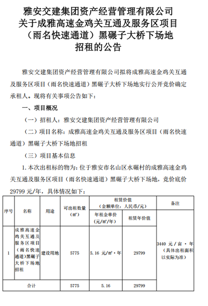 關(guān)于成雅高速金雞關(guān)互通及服務(wù)區(qū)項(xiàng)目(雨名快速通道)黑碾子大橋下場(chǎng)地招租的公告