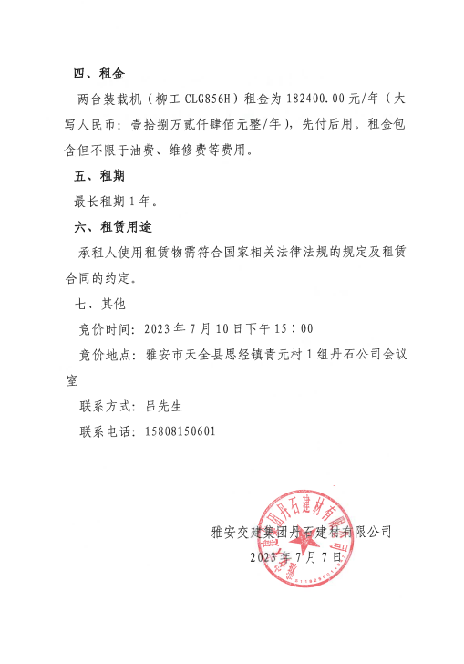 雅安交建集團(tuán)丹石建材有限公司關(guān)于2臺(tái)裝載機(jī)公開(kāi)招租的公告附件
