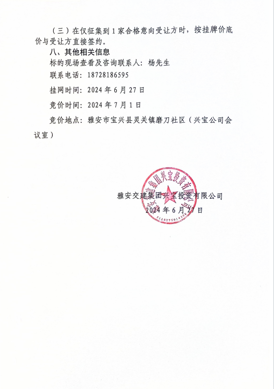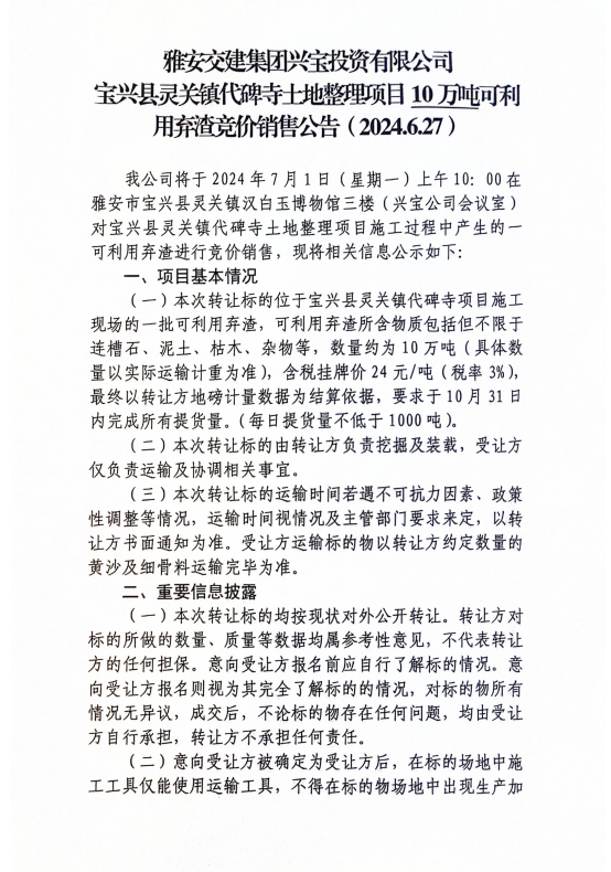 雅安交建集團(tuán)興寶投資有限公司寶興縣靈關(guān)鎮(zhèn)代碑寺土地整理項(xiàng)目10萬噸可利用棄渣競價(jià)銷售公告(2024.6.27)