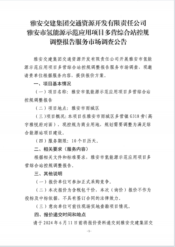 雅安交建集團(tuán)交通資源開發(fā)有限責(zé)任公司雅安市氫能源示范應(yīng)用項(xiàng)目多營綜合站控規(guī)調(diào)整報告服務(wù)市場調(diào)查公告