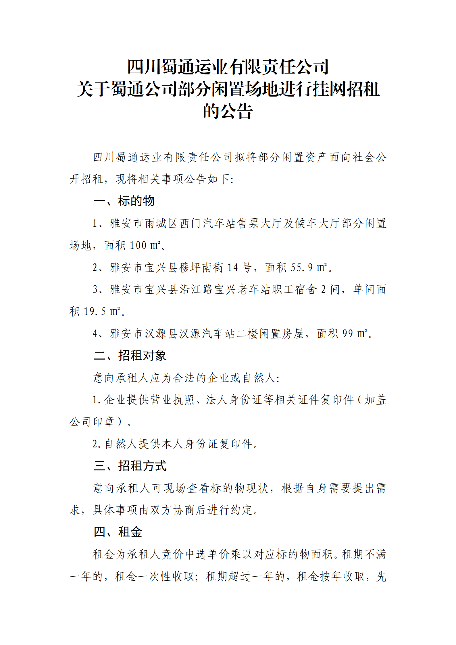 四川蜀通運(yùn)業(yè)有限責(zé)任公司 關(guān)于蜀通公司部分閑置場地進(jìn)行掛網(wǎng)招租的公告