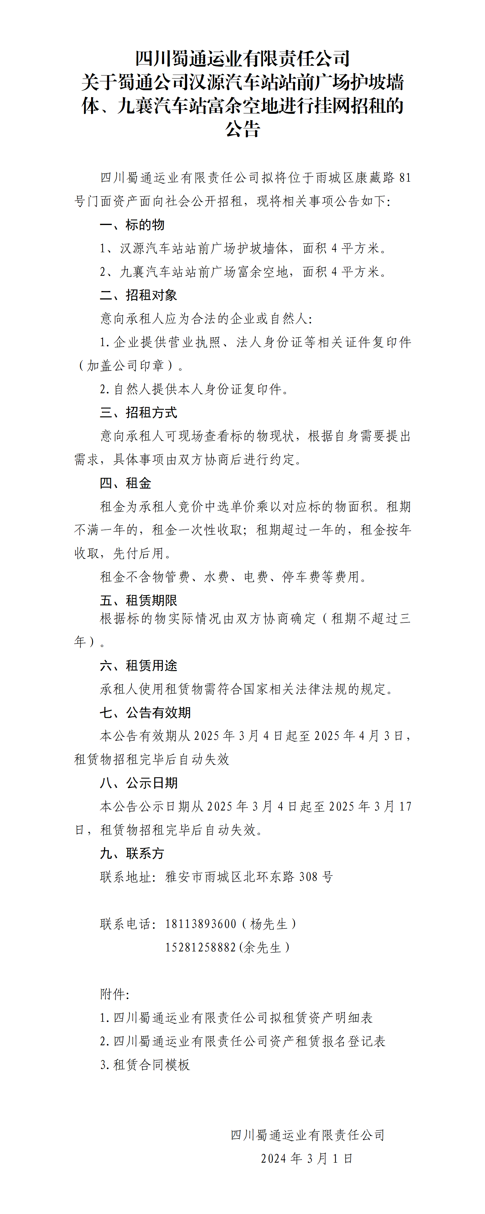 四川蜀通運(yùn)業(yè)有限責(zé)任公司 關(guān)于蜀通公司漢源汽車(chē)站站前廣場(chǎng)護(hù)坡墻體、九襄汽車(chē)站富余空地進(jìn)行掛網(wǎng)招租的公告