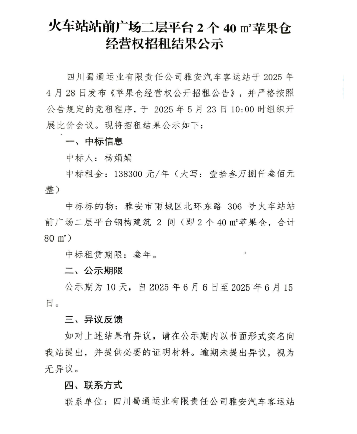 火車站站前廣場二層平臺(tái)2個(gè)40㎡蘋果倉經(jīng)營權(quán)招租結(jié)果公示
