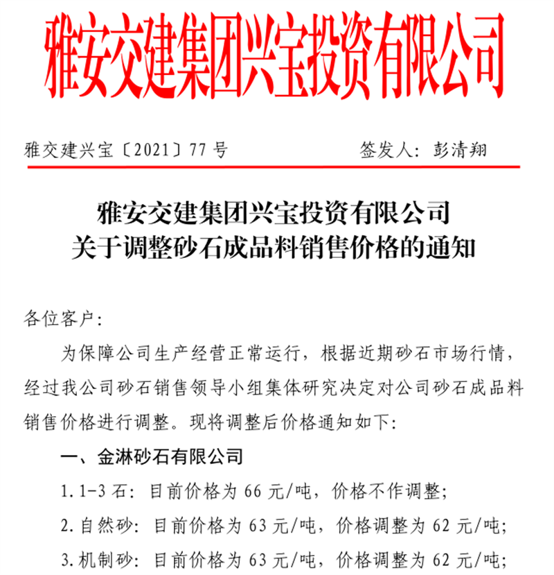 雅安交建集團(tuán)云石公司關(guān)于調(diào)整成品料銷(xiāo)售價(jià)格的通知(2021.11.4)
