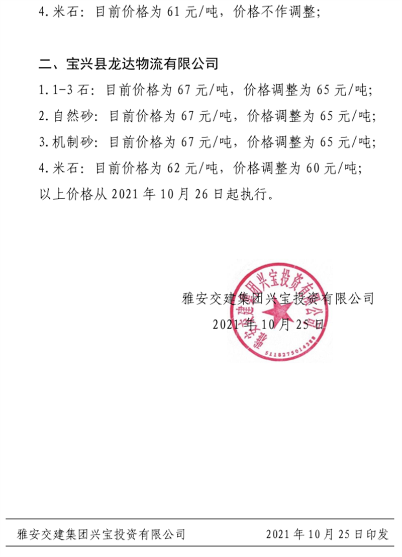 雅安交建集團(tuán)興寶公司關(guān)于調(diào)整成品料銷(xiāo)售價(jià)格的通知(2021.10.26)