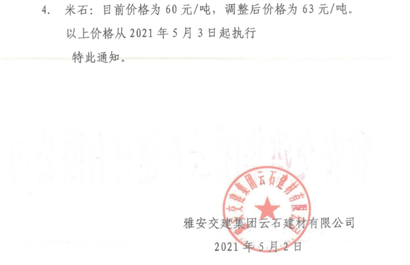 雅安交建集團(tuán)云石公司砂石骨料銷(xiāo)售價(jià)格情況表(2021.5.3)