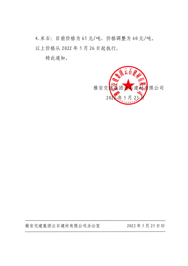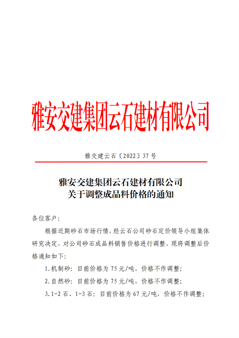 雅安交建集團云石建材有限公司 關于調(diào)整成品料價格的通知--2022-5-25