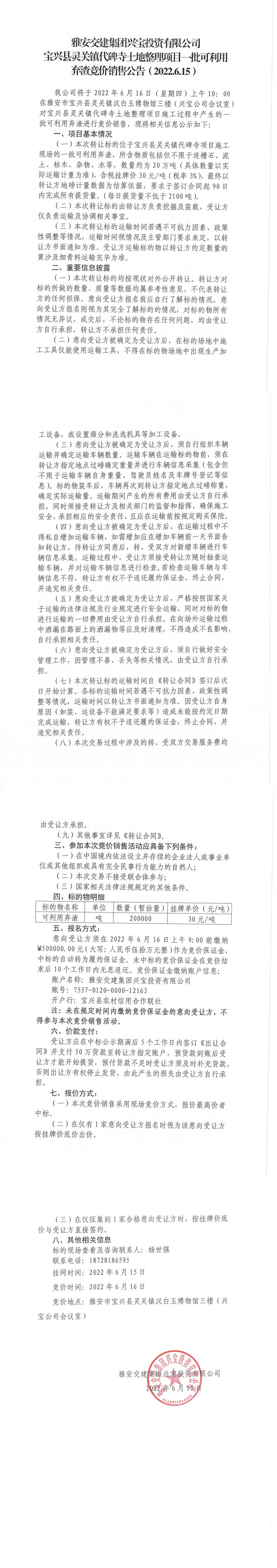 雅安交建集團(tuán)興寶投資有限公司寶興縣靈關(guān)鎮(zhèn)代碑寺土地整理項(xiàng)目-批可利用 棄渣競(jìng)價(jià)銷售公告( 2022.6.15 )