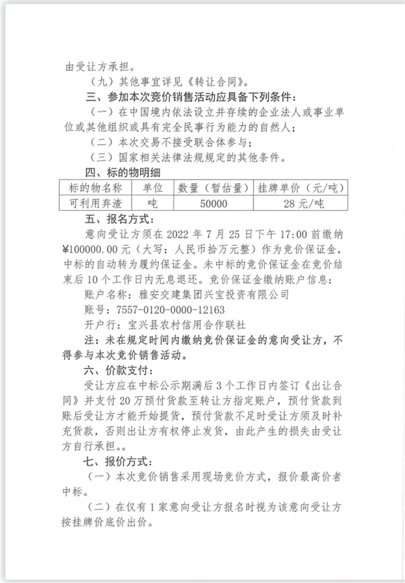 興寶公司寶興縣靈關鎮(zhèn)代碑寺土地整理項目10萬噸可利用棄渣競價銷售掛網(wǎng)公告掛網(wǎng)公告7.22(5萬噸)
