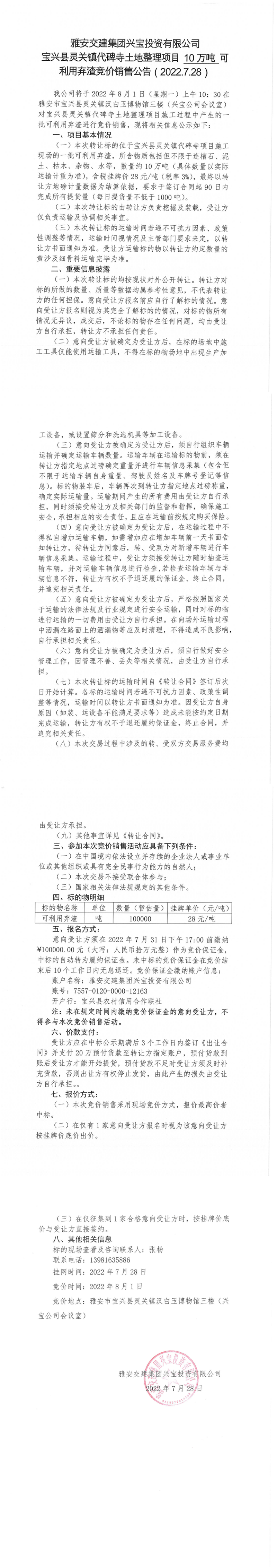 雅安交建集團(tuán)興寶投資有限公司靈關(guān)鎮(zhèn)代碑寺土地整理項(xiàng)目5萬(wàn)噸可利用棄渣競(jìng)價(jià)銷售公告(2022.7.28)