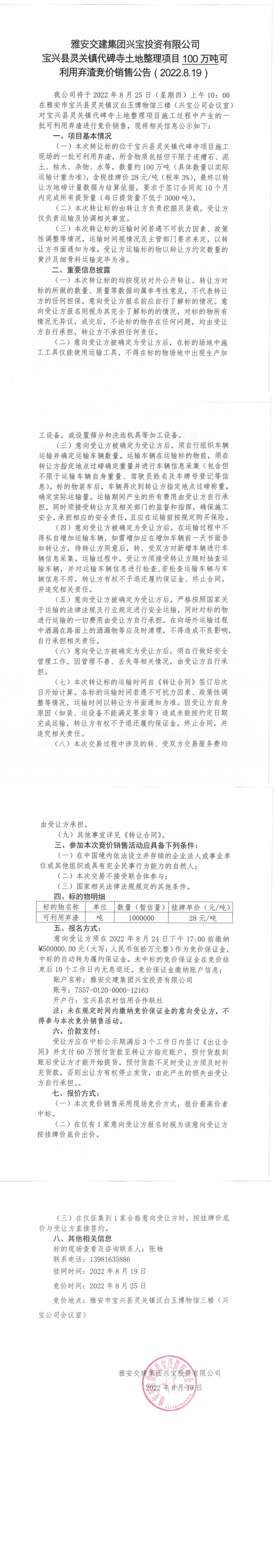 雅安交建集團(tuán)興寶投資有限公司靈關(guān)鎮(zhèn)代碑寺土地整理項(xiàng)目10萬(wàn)噸可利用棄渣競(jìng)價(jià)銷售公告(2022.8.19)(1)