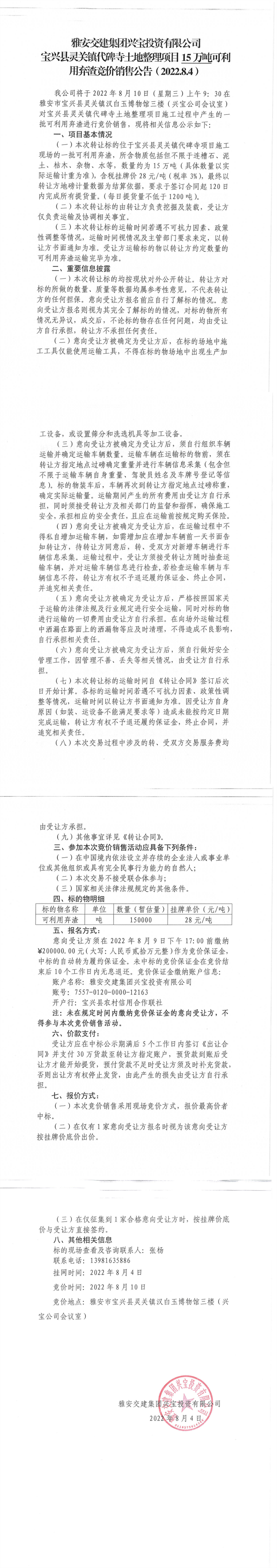 雅安交建集團興寶投資有限公司靈關(guān)鎮(zhèn)代碑寺土地整理項目15萬噸可利用棄渣競價銷售公告(2022.8.4)