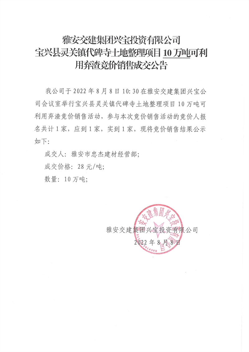 代碑寺土地整理項(xiàng)目100萬噸可利用棄渣競(jìng)價(jià)銷售成交公告