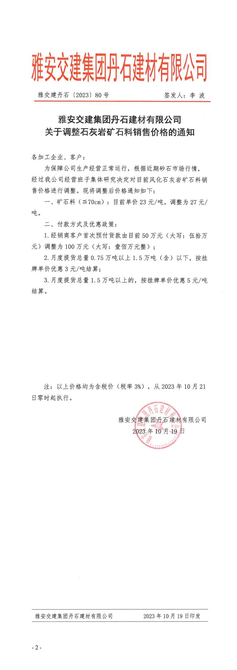 雅安交建丹石公司關于石灰?guī)r礦石料調價的通知--2023.10.20