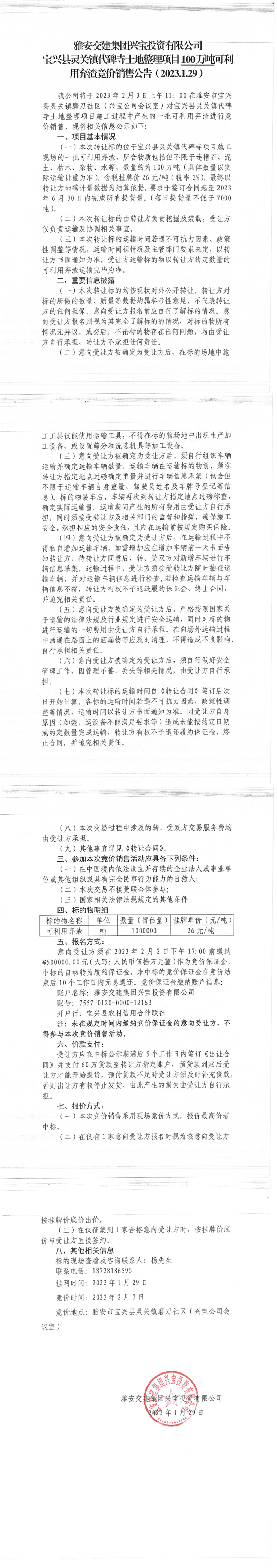 雅安交建集團(tuán)興寶投資有限公司靈關(guān)鎮(zhèn)代碑寺土地整理項(xiàng)目100萬(wàn)噸可利用棄渣競(jìng)價(jià)銷售公告(2023.1.29)