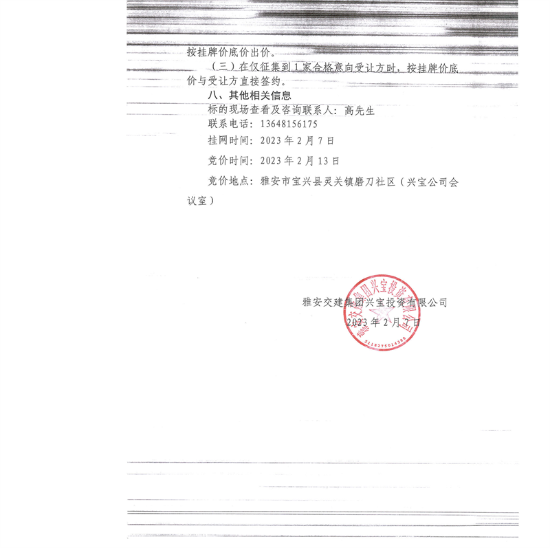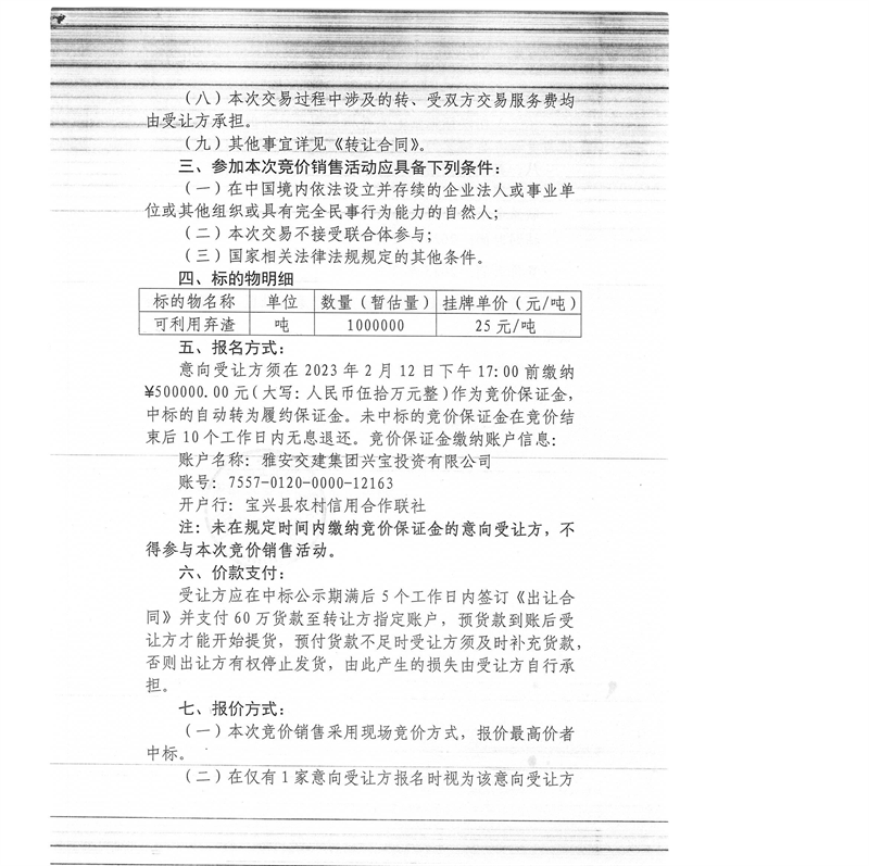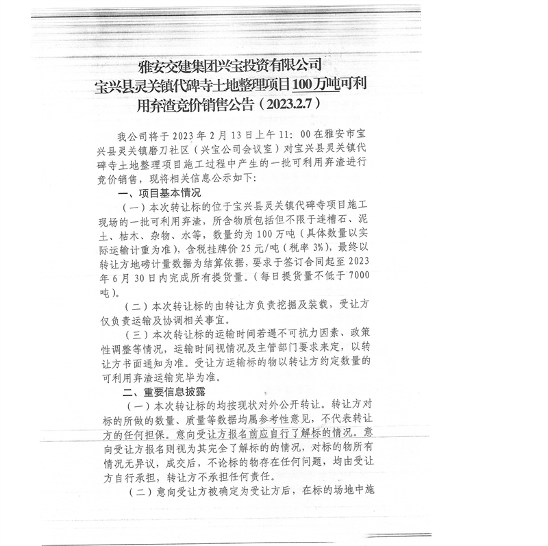 雅安交建集團(tuán)興寶投資有限公司100萬噸可利用棄渣競(jìng)價(jià)銷售流標(biāo)公告(2023.2.13)