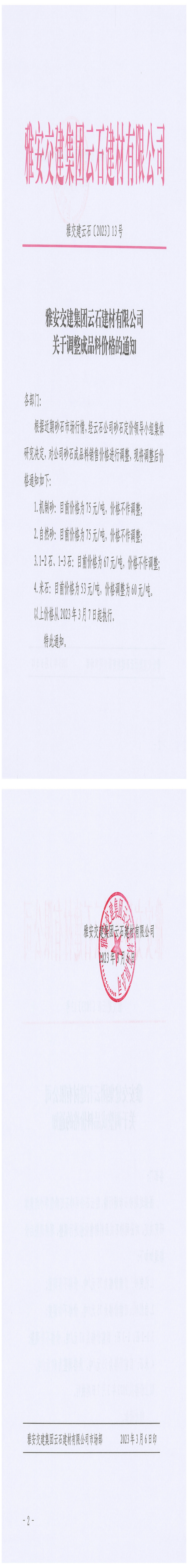 雅安交建集團云石建材有限公司關(guān)于調(diào)整成品料價格的通知-2023-03-06