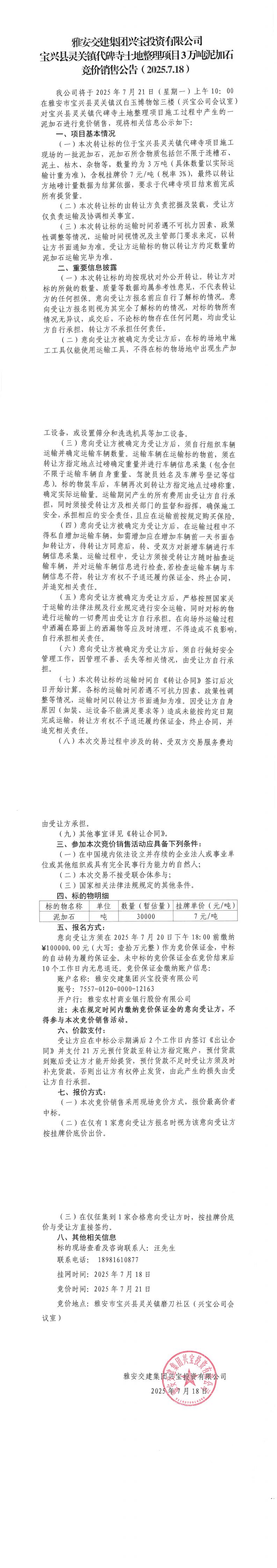 雅安交建集團(tuán)興寶投資有限公司3萬噸泥加石競價銷售掛網(wǎng)公告